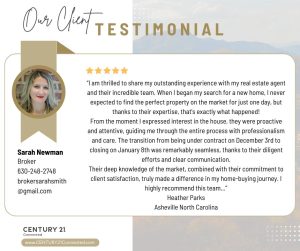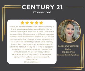 “Hello, we were referred to Sarah Newman Smith by a friend we are super glad we were able to utilize her services. We only had a few days in North Carolina but she was able to drive us around to different properties and explain the different areas of Asheville to us which gave us a really clear direction on what we wanted and the location we wanted to purchase. Sarah was very honest, direct, communicative, and knowledgeable about the market. Not only did she find us a property in 24 hours, but the closing was very smooth and without incident. We are very happy with our experience, and not only do we now have a great agent, we feel we have a great friend as well. Thanks Sarah!” - Chris and Renee