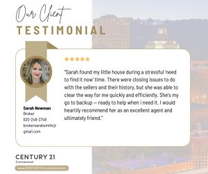 “Sarah found my little house during a stressful ‘need to find it now’ time. There were closing issues to do with the sellers and their history, but she was able to clear the way for me quickly and efficiently. She’s my go to backup — ready to help when i need it. I would heartily recommend her as an excellent agent and ultimately friend.”